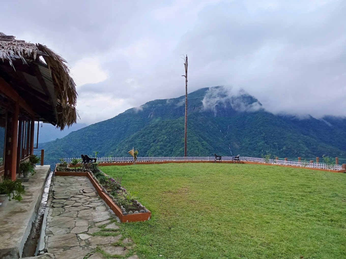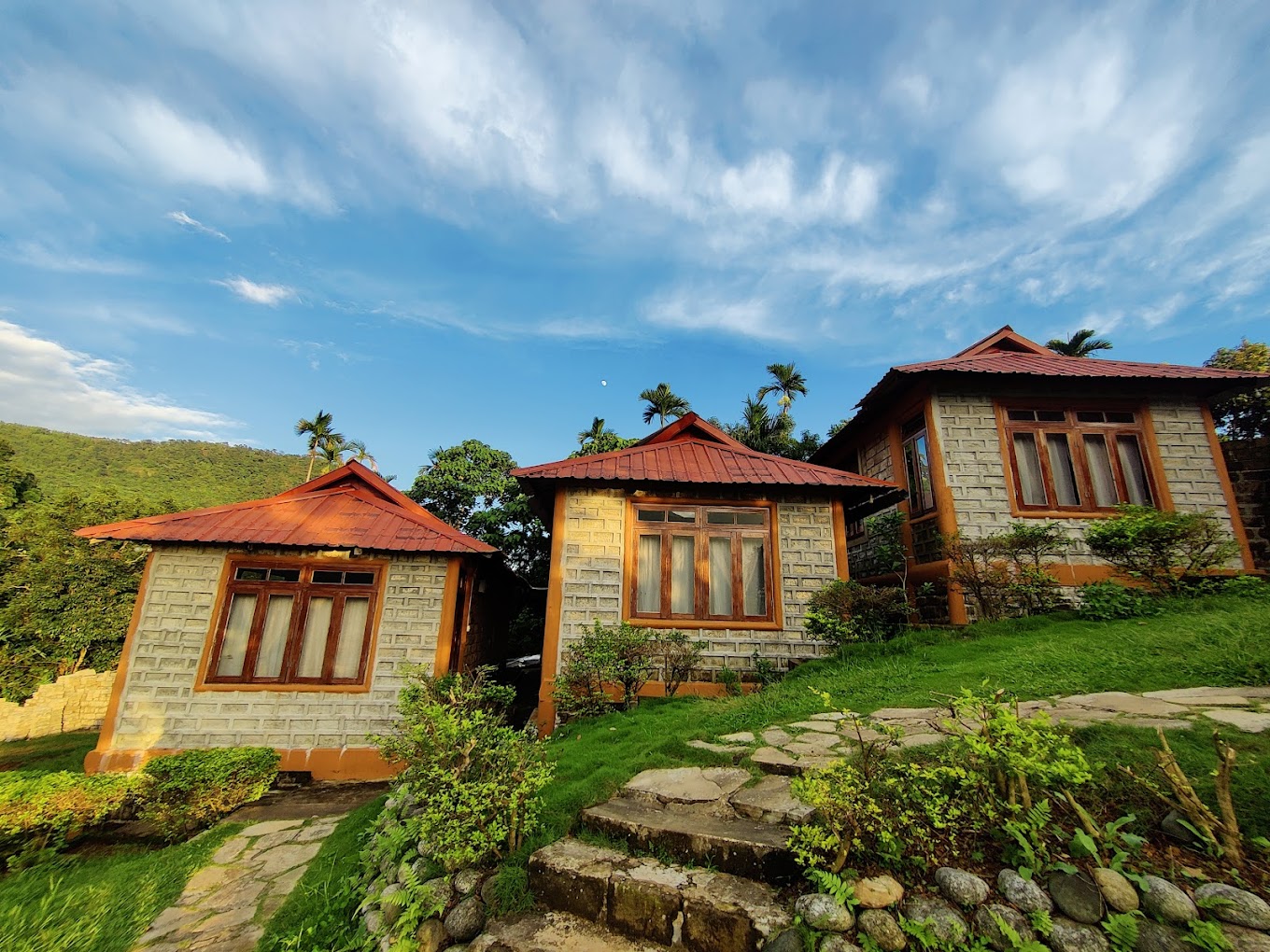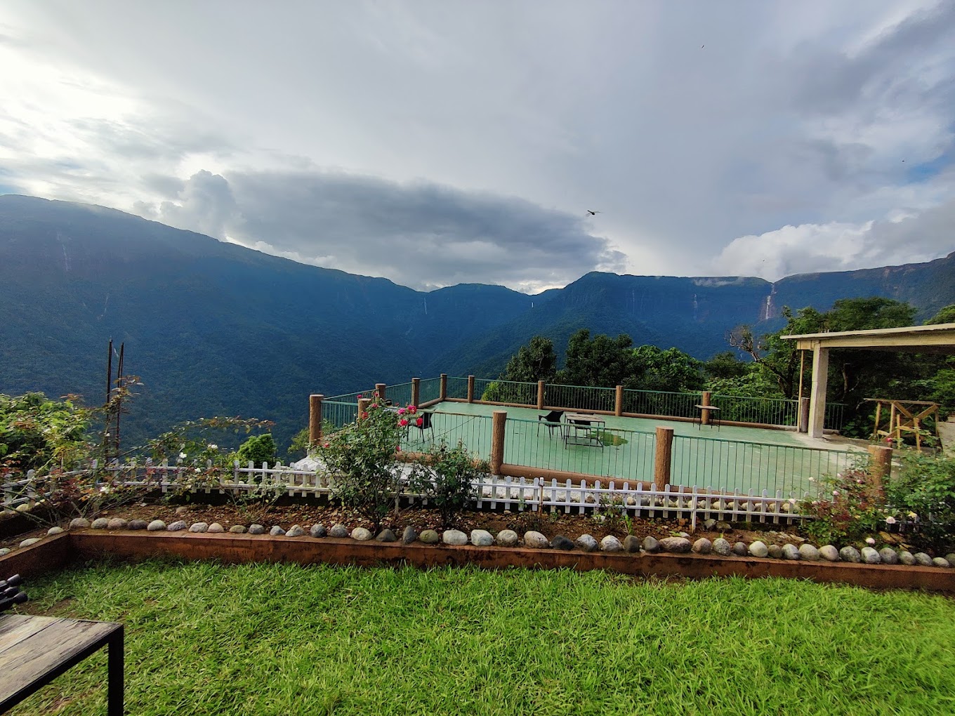 Smoky Falls Mae Fi Resort is perched on a hill, offering stunning views of gorges, mountains, and many waterfalls flowing from the Sohra-Mawsahew platform. The resort is surrounded by steep ravines on the west, east, and north sides, with gentle slopes at the entrance on the east. The area has diverse geology, with fractured quartzites in the west and north, resulting in thin black soil. Towards the south and east, the rocks are decomposed Khasi green stones, and the soil is red, thick, and sticky during the monsoons. While the resort covers about two acres, the breathtaking scenery and natural beauty make it feel much larger.